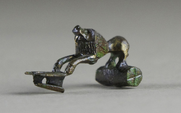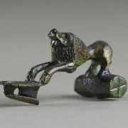 Fibule en alliage cuivreux, représentant un lion dont les pattes arrière reposent sur un cylindre décoré et dont les pattes avant prennent appui sur une queue de paon. L'aiguille servant d'attache est manquante.