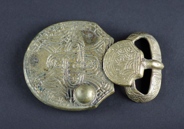 Plaque-boucle en bronze à trois bossettes à l'origine dont il n'en subsiste plus qu'une. Décor central de quadrilobe.
