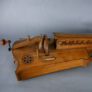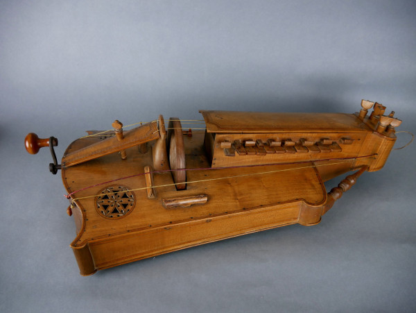 Cette vielle à roue est un instrument rare : daté, signé, localisé et en excellent état de conservation compte tenu de son ancienneté. Elle est en bois orné d’un fin décor tracé et vernis en orangé, d’une série de marques au feu en forme de festons et de petites fleurs, d’ouïes en forme de rosaces ajourées et de colonnettes en bois tourné. Son clavier est annoté.